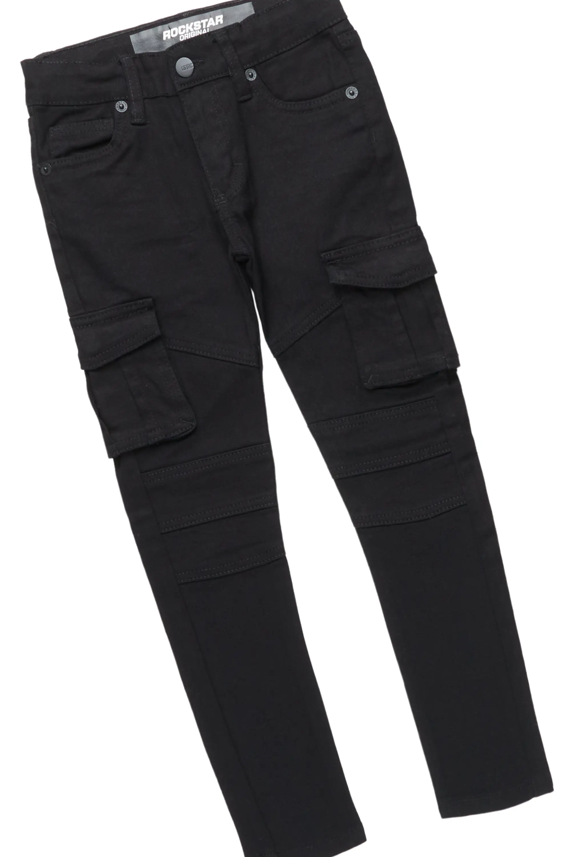 An urban two-piece hoodie and cargo flare jean set for kids. Designed with organic cotton and utility pockets for the perfect streetwear all-in-one set.