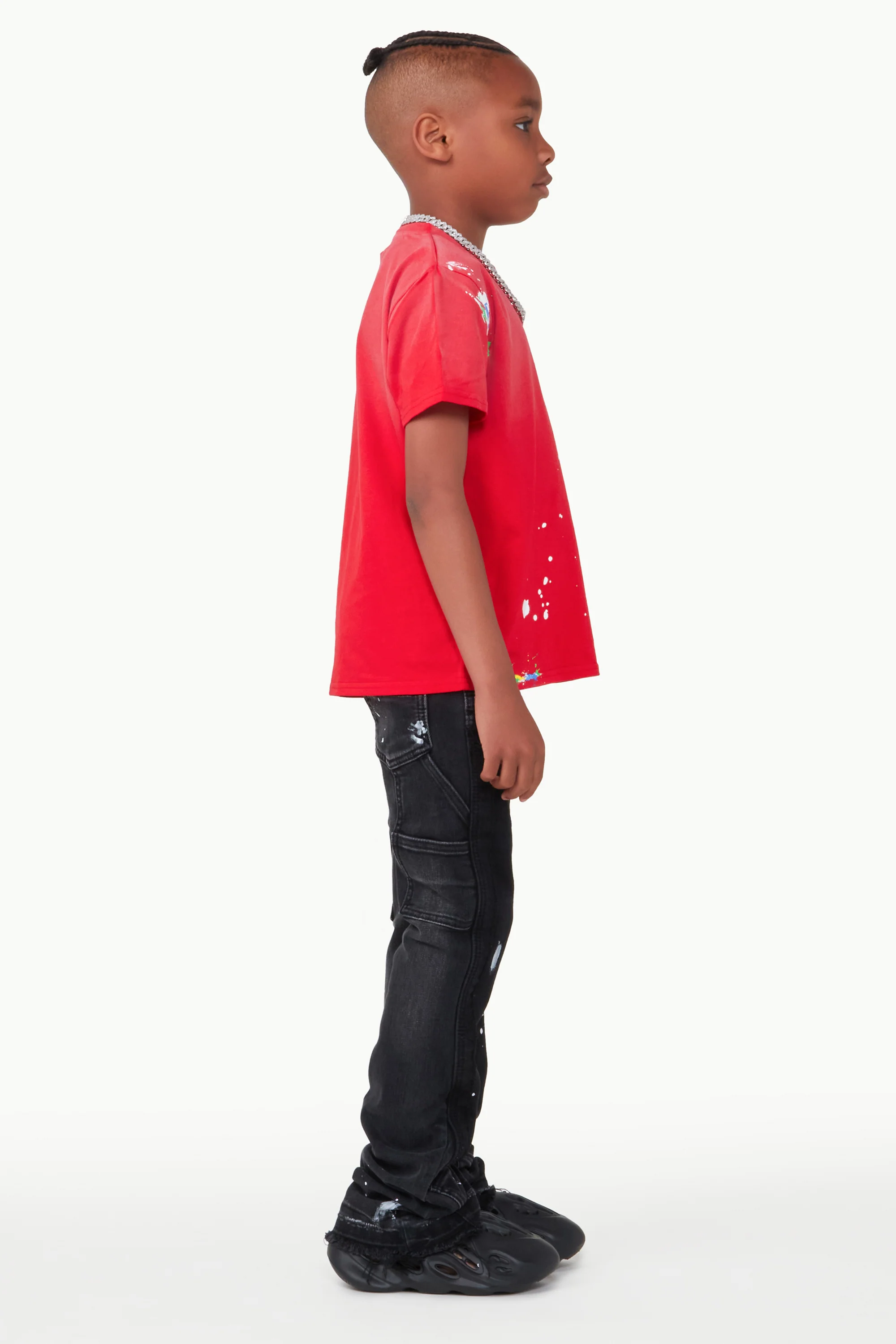 A two-piece t-shirt and denim jean set for kids in red. Designed with organic cotton and custom splatter paint detailing for the perfect all-in-one set.
