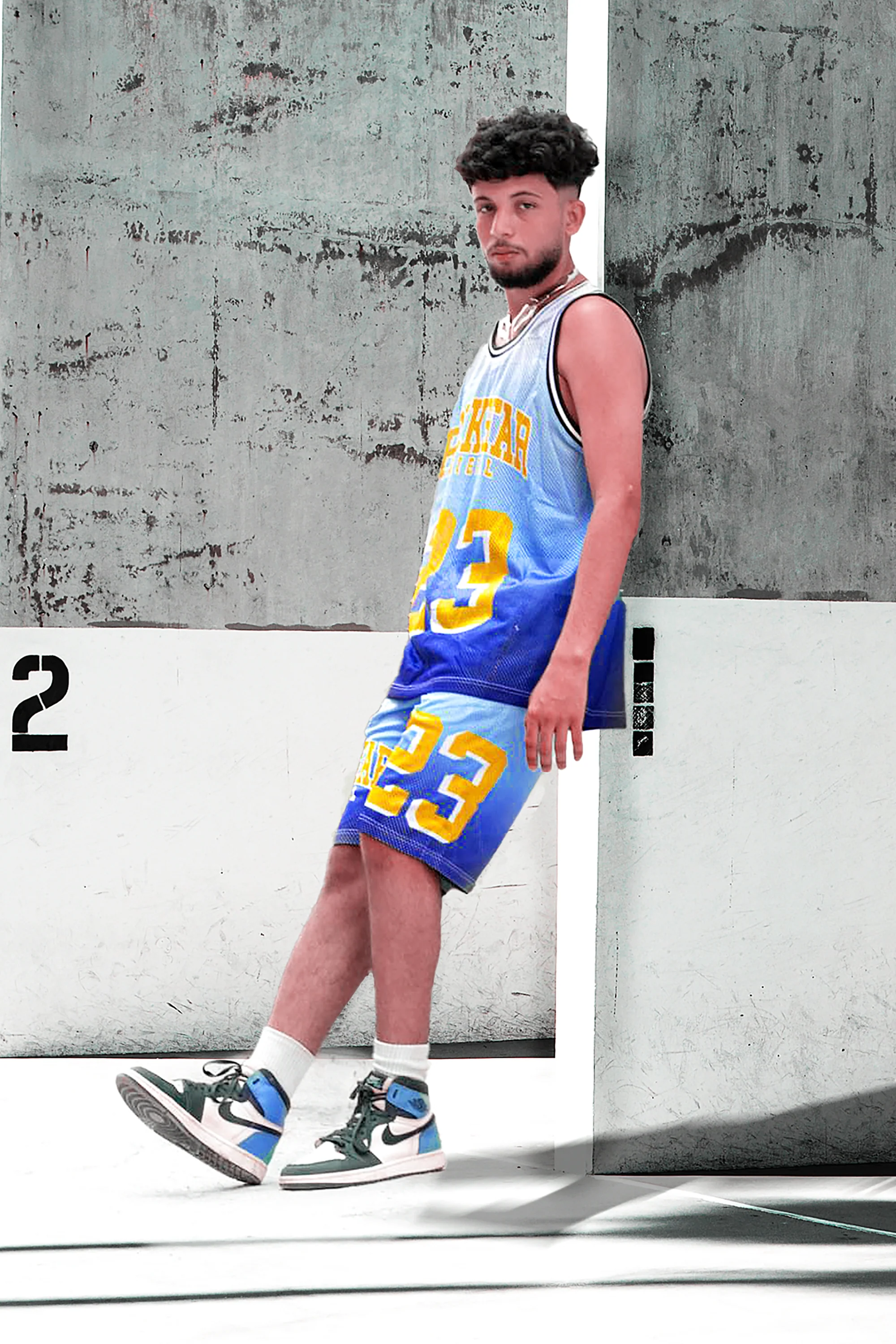 Rockstar Original Men's two-piece short set in blue. Featuring printed RSO logos and varsity numbers on the top and bottoms with an ombre finish throughout. Jersey accents rib knit sleeveless arms and neckline with mesh fabric while bottoms accent a ribbed drawstring waistband with mesh fabric and high-quality zipper pockets.